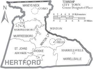 The county is divided into six townships: Ahoskie, Como, Harrellsville, Murfreesboro, St. Johns and Winton.