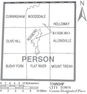 The county is divided into nine township districts: Allensville, Bushy Fork, Cunningham, Flat River, Holloway, Mount Tirzah, Olive Hill, Roxboro, and Woodsdale (which includes Bethel Hill).