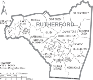 The county is divided into 14 townships: Camp Creek, Chimney Rock, Colfax, Cool Spring, Duncans Creek, Gilkey, Golden Valley, Green Hill, High Shoals, Logan Store, Morgan, Rutherfordton, Sulphur Springs, and Union.